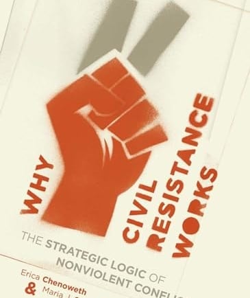 Erica Chenoweth and Maria Stephan's research on 323 movements over many decades shows us that nonviolent civil resistance campaigns attract a larger number of people because of a much lower barrier to participation compared with using violence. Their research also shows us that we about 3.5% of our population to become active in the movement and there are many ways for us all to contribute.